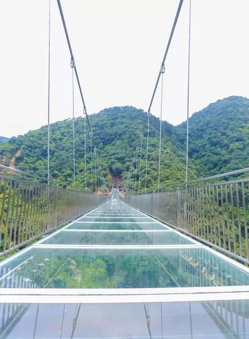 古龍峽玻璃橋全長329米,平均寬度3.8米,最寬處6.8米,橋上2個港灣式透明觀景凸臺位于最寬處,和UFO玻璃平臺遙相呼應。作為世界最寬的觀瀑玻璃橋,在國內第一家采用超大面積玻璃,橋面可以容納5人并行,也可從容地拍下全身照,面積達40平方米港灣式觀景凸臺設置了5D聲光電特效裝置,感應到游客經過時,會出現“山崩地裂”“玻璃破碎”等奇幻效果。經浙江大學土木工程系測試,玻璃橋靜態(tài)負載可超過700人。
